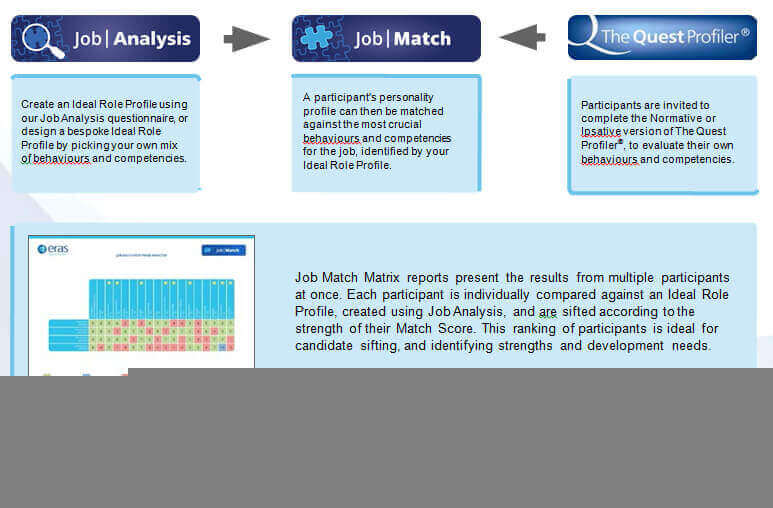 - Identify the behaviours and competencies which are important to a role, and compare them to The Quest Profiler® or Job Match Matrix reports