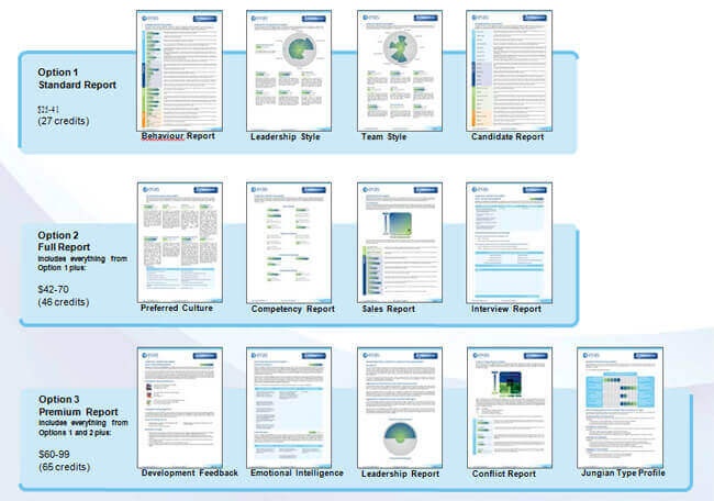 Three levels of personality reports are available using The Quest Profiler®: Standard, Full, and Premium reports. These reports have varying levels of content, and vary in cost accordingly. The price of a report depends on how many credits have been purchased in advance, and for convenience minimum and maximum prices are shown below. For Matrix reports (scores only), please see Job Analysis and Matching.